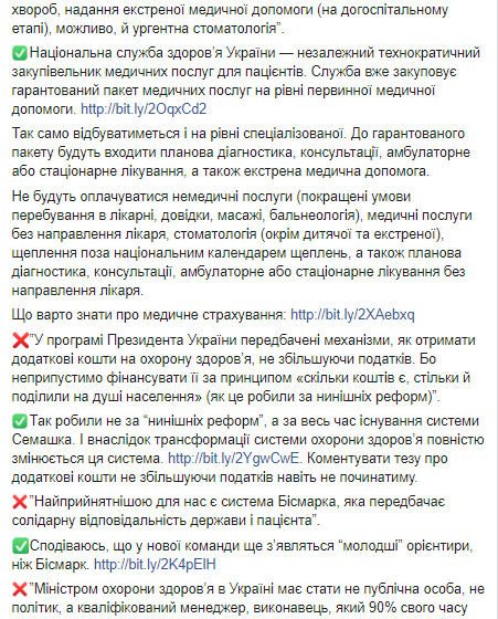"Политики регулярно меняются, но внедрение выбранной государственной политики должно продолжаться. Старт с нуля с приходом каждого нового министра — одна из причин, почему желаемые изменения не произошли раньше. Поэтому когда в 2016 году мы пришли в Министерство, приняли стратегию, которую готовили эксперты до нас, и начали ее претворять в жизнь. Сначала мы больше года боролись за принятие закона “О государственных финансовых гарантиях медицинского обслуживания населения”. Именно с его принятия началось системное внедрение трансформации медицинской системы", - отметила Супрун.