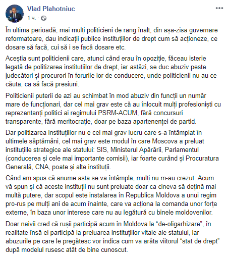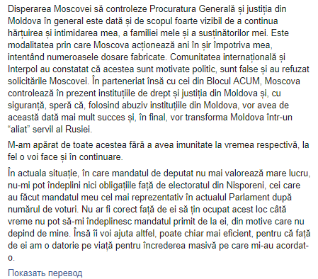 "В нынешней ситуации, когда мандат депутата больше не стоит ничего, я не могу выполнить обязательства перед электоратом в Ниспоренах, перед теми, кто сделал мой мандат наиболее представительным в нынешнем парламенте по количеству голосов. Было бы несправедливо занимать это место до тех пор, пока я не смогу выполнять свой мандат, полученный от них, по причинам, которые не зависят от меня", - написал Плахотнюк.