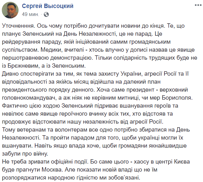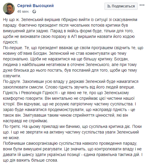 В-третьих. На этом примере мы видим, что общественная критика действует. Пока что. И что не обращать на активную часть общества внимания Зеленский не может. Увидев самоорганизацию общества вокруг проведения парада, они были вынуждены реагировать. Это значит, что контролировать власть и не давать ей шанса сдать украинские позиции - единственная правильная тактика действий. И что действие весит больше слова", - написал Высоцкий.