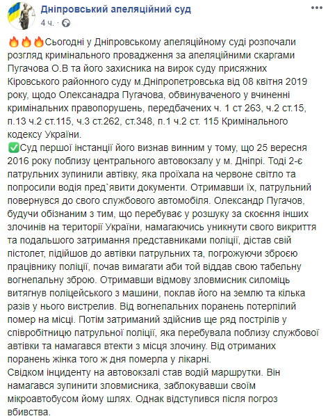 Напомним, 25 сентября 2016 года в Днепре возле автовокзала Пугачев за рулем авто был задержан двумя полицейскими за нарушение правил дорожного движения. Он расстрелял правоохранителей, получил в перестрелке ранение, но это не помешало ему скрыться с места ЧП. Однако вскоре он был задержан. На месте инцидента погиб полицейский Артем Кутушев, а его напарница Ольга Макаренко скончалась в больнице.