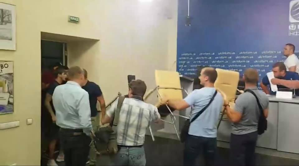 Три человека пострадали в ходе погрома, учиненного группой лиц в футболках общественной организации "Традиция и порядок" в пресс-центре информационного агентства "Укринформ" в Киеве.