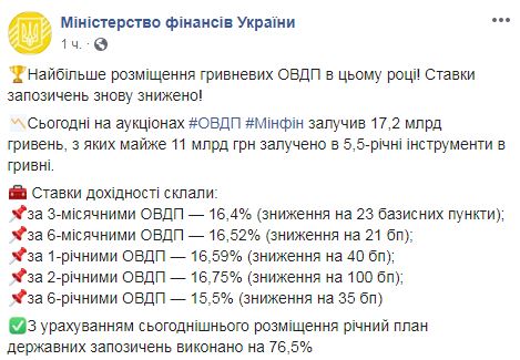 Как сообщает пресс-служба Минфина в Facebook, это крупнейшее размещения гривневых ОВГЗ в этом году.