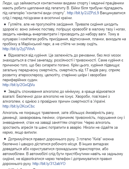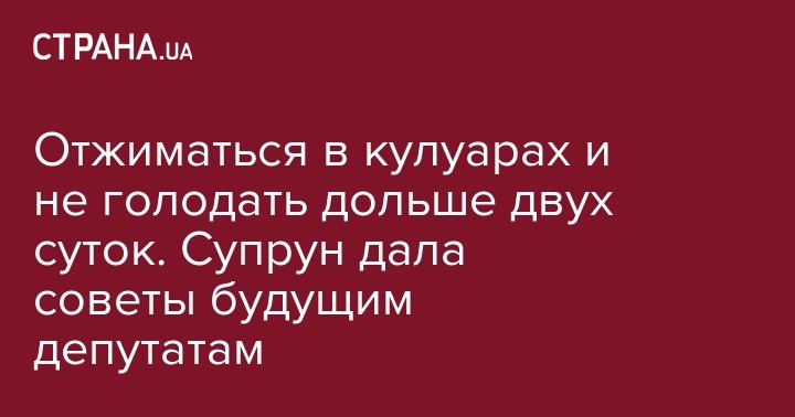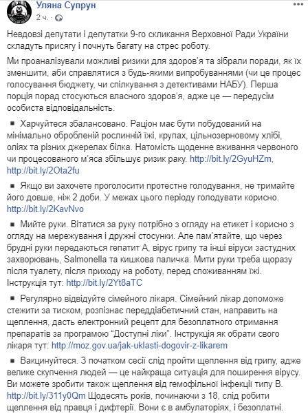 И.о миннистра здравоохранения Ульяна Супрун в соцсети рассказала будущим нардепам о том, как уберечь свое здоровье на работе. По словам чиновницы, советы были составлены после анализа возможных рисков для здоровья, с которыми нардепы могут столкнуться при выполнении служебных обязанностей и таких испытаний, как процесс голосования за бюджет или общение с детективами НАБУ.