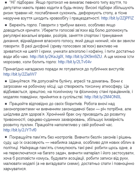 • "Нет" каблукам. Если протокол не требует определенного типа обуви, то депутаты имеют право ходить в любой. Высокие каблуки увеличивают риск травмы ног, ослабление сухожилий, деформируют стопу, а тесная неудобная обувь вредит кровообращению и работоспособности.