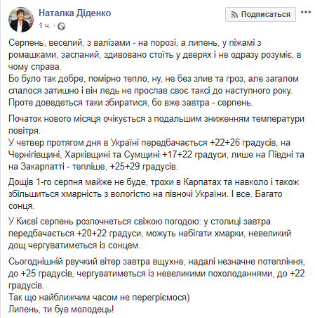 "Август, веселый, с чемоданами - на пороге, а июль, в пижаме с ромашками, заспанный, удивленно стоит в дверях и не сразу понимает, в чем дело. Потому что было так хорошо, умеренно тепло, ну, не без ливней и гроз, но в целом спалось комфортно, и он едва не проспал свое такси до следующего года. Однако придется таки собираться, потому что завтра - август", - написала Наталья Диденко.