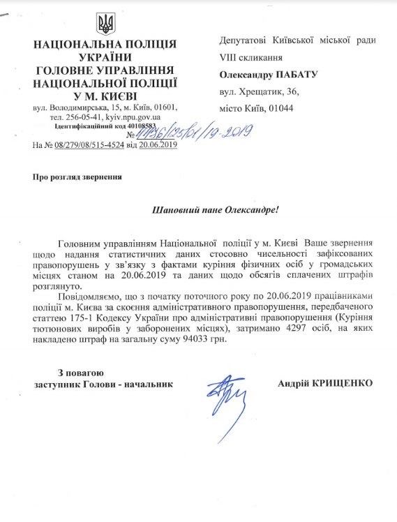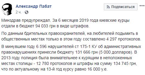 "За 6 месяцев 2019 года киевские курильщики отдали в бюджет 94 тысячи 33 гривни в виде штрафов. По данным бдительных правоохранителей, на любителей подымить в общественных местах только в этом году составлено 4 297 протоколов", - пишет Пабат.