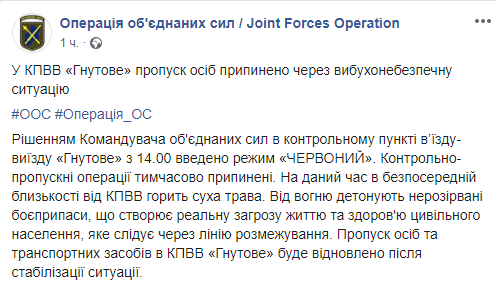 Отмечается, ныне в непосредственной близости от КПВВ горит сухая трава, и от огня детонируют неразорвавшиеся боеприпасы, что создает угрозу жизни и здоровью граждан. В пресс-центре заверили, что пропуск людей и транспортных средств в КПВВ «Гнутово» будет возобновлен после стабилизации ситуации.