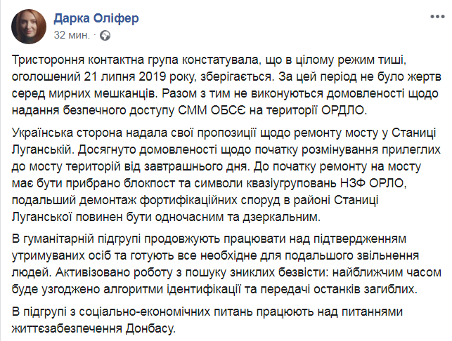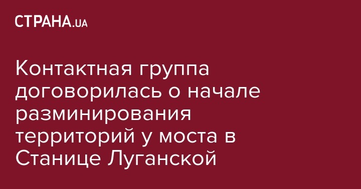 31 июля на заседании в Минске Трехсторонней контактной группы (ТКГ) по урегулированию ситуации на Донбассе принято решение о начале разминирования территорий, прилегающих к мосту в Станице Луганской. Об этом сообщила на своей странице в Facebook пресс-секретарь представителя Украины в ТКГ Леонида Кучмы Дарка Олифер.