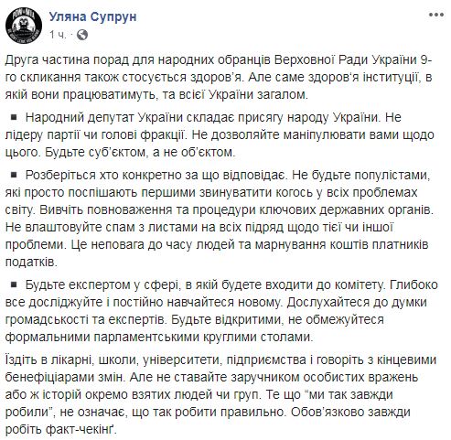 "Вторая часть советов для народных избранников Верховной Рады Украины 9-го созыва также касается здоровья. Но именно здоровья института, в котором они будут работать, и всей Украины в целом", - отметила и.о. министра здравоохранения.