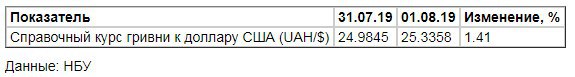 Справочный курс гривни по отношению к доллару США на межбанковском валютном рынке по состоянию на 12:00 кв 1 августа 2019 года понизился до 25,34 грн/$1 со вчерашних 24,98 грн/$1. Об этом сообщает "Интерфакс-Украина".