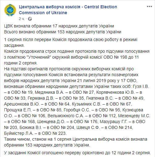 В Центральной избирательной комиссии на заседании в четверг признали избранными на досрочных парламентских выборах, которые прошли 21 июля, 17 народных депутатов. Таким образом, всего избранными признали 153 депутата. Об этом сообщает пресс-служба ЦИК в Facebook.