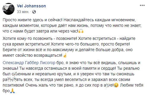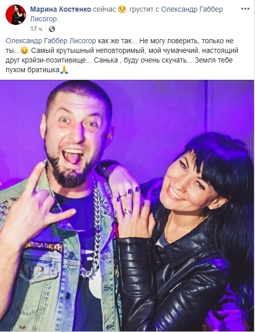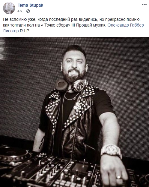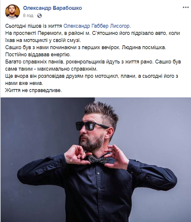 "Саша был с нами начиная с первых вечеринок. Человек улыбка. Постоянно отдавал энергию. Многие настоящие панки, рок-н-рольщики уходят из жизни рано. Саша был именно таким - максимально настоящим. Еще вчера он рассказывал друзьям о мотоцикле, планы, а сегодня его с нами уже нет. Жизнь несправедлива", - написал Александр Барабошко.