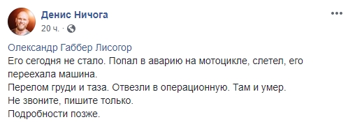 Подробности происшествия рассказал Денис Ничога: "Попал в аварию на мотоцикле, слетел, его переехала машина. Перелом груди и таза. Отвезли в операционную. Там и умер".