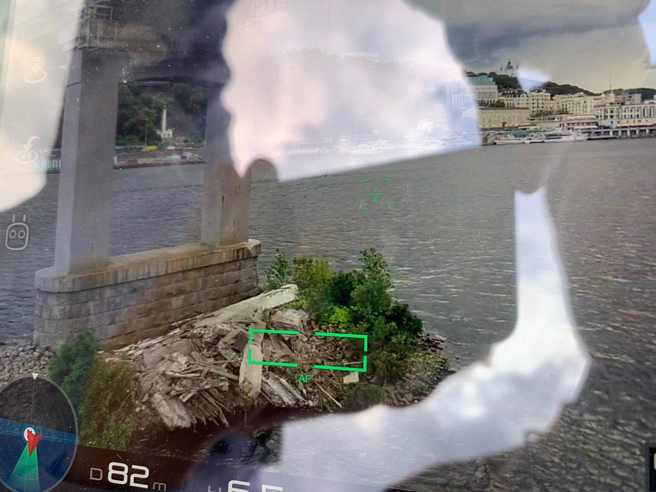 Обвалившийся фрагмент бетонной балки и сейчас находится под одной из центральных опор моста. На месте работают представители коммунальных служб. Двоих их представителей, одетых в оранжевые жилеты, к обрушенной части путепровода привезли на катере.