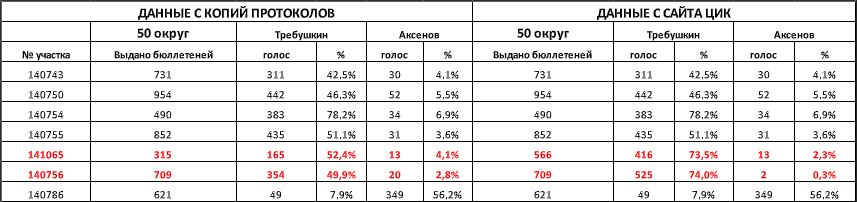 Проблемы возникли на двух участках округа - 141065 и 140756. В частности, на первом из них по данным из копий протоколов результат оказался таковым: Требушкин (165) - Аксенов (13), то есть +152 голоса в пользу первого. Во втором участке: Требушкин (354) - Аксенов (20) и +334 в пользу Требушкина. В сумме +486 в пользу Требушкина.