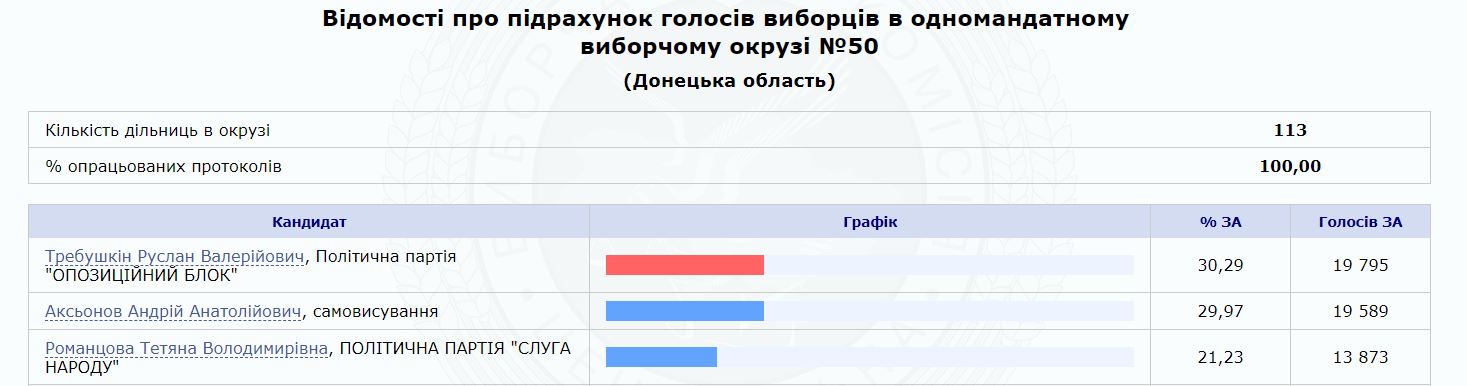 По данным ЦИК, обработавшей 100% протоколов на округе, победу одержал мэр Покровска (бывший Красноармейск) Руслан Требушкин, представляющий "Оппозиционный блок" (19 795 голосов). Вторым же финишировал самовыдвиженец Андрей Аксенов, мэр Доброполья (19 589 голосов). Разница между ними, по версии Центризбиркома, всего лишь 206 голосов.