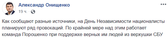 "Как сообщают разные источники, на День Независимости националисты планируют ряд провокаций. По крайней мере над этим работает команда Порошенко при поддержке верных им людей из верхушки СБУ".