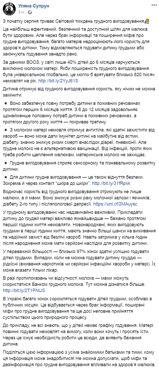 И.о. министра здравоохранения Ульяна Супрун по случаю Всемирной недели грудного вскармливания рассказала, как правильно кормить младенцев материнским молоком. Соответствующий пост опубликован на ее странице в Facebook.