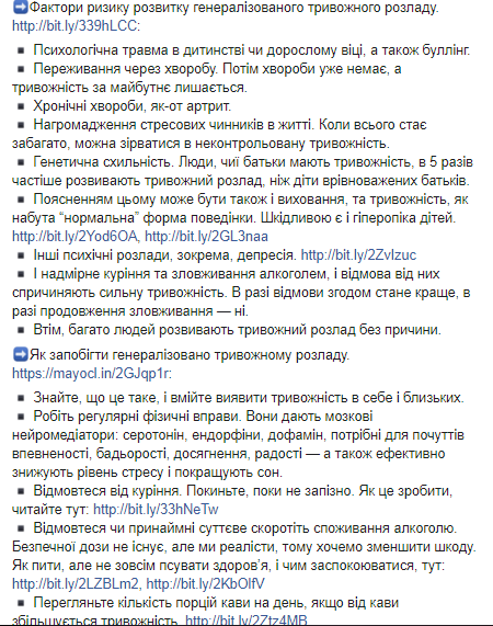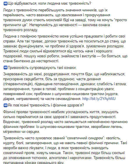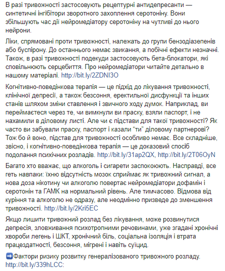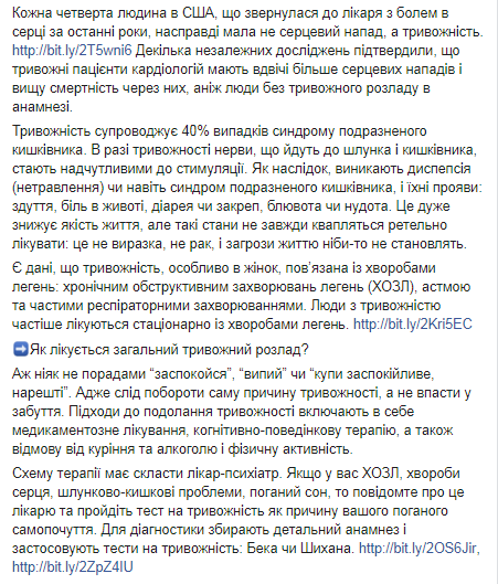"При генерализованном тревожном расстройстве (generalised anxiety disorder) человек практически всегда находится в тревожном состоянии без особой причины более 6 месяцев. Таким людям трудно вспомнить, когда они последний раз были спокойны, и они переживают из-за денег, здоровья, семьи, работы, ситуации в стране и мнимых возможных проблем. Такая тревожность присуща людям всех социальных категорий, профессий и национальностей. Тревожные люди склонны отказываться от чего-то как и хорошего: путешествий, поиска новой работы, знакомств и выступлений - потому что боятся, что станет тревожно к непереносимости", - написала Ульяна Супрун.