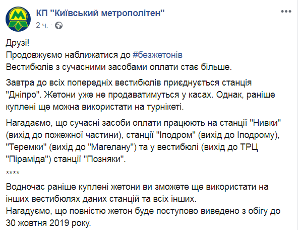 "Вестибюлей с современными средствами оплаты становится больше. Завтра ко всем предыдущим вестибюлям присоединяется станция "Днепр". Жетоны уже не будут продаваться в кассах. Однако ранее купленные еще можно использовать на турникете", - написано в сообщении.