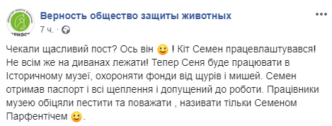 "Кот Семен трудоустроился! Не всем же на диванах лежать! Теперь Сеня будет работать в Историческом музее, охранять фонды от крыс и мышей. Семен получил паспорт и все прививки и допущен к работе. Работники музея обещали ласкать и уважать, называть только Семеном Парфентичем", - говорится в сообщении "Верности".