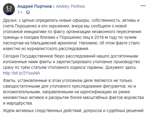 Как рассказал Портнов, Порошенко фигурирует в делах относительно использования поддельных документов для совершения этой поездки. Помимо этого, в рамках дела, как пишет Портнов, следователи поставили цель "определить новые офшоры, собственность, активы и счета Порошенко".