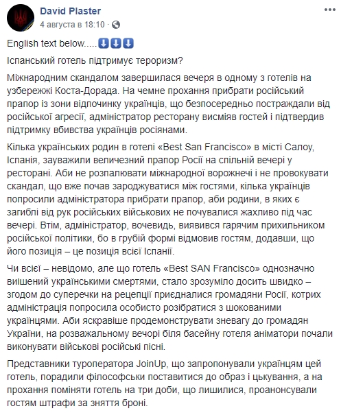 Ситуацию описал в своем Facebook пользователь Дэвид Пластер. По его словам, в четырехзвездочном отеле Best San Francisco в городе Салоу в Каталонии несколько туристов из Украины заметили российский флаг во время ужина и потребовали, чтобы его убрали, поскольку среди них есть непосредственно пострадавшие от российской агрессии. Однако администратор гостиницы заявил, что является сторонником российской политики и что его позиция - "это позиция всей Испании".