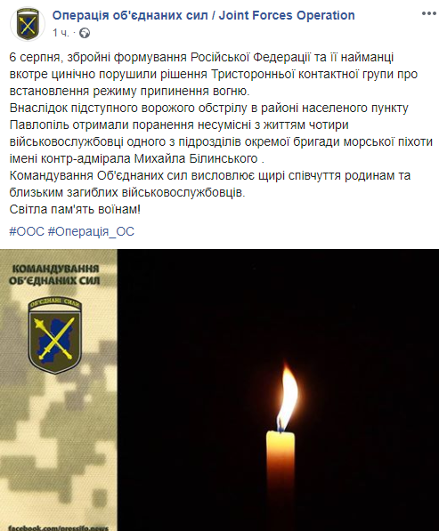 "Сегодня в результате обстрела в районе Павлополь погибли 4 украинских военнослужащих. Бойцы 36-й бригады морской пехоты занимались инженерным оборудованием позиций взводный-опорного пункта, когда боевики коварно открыли огонь из ручного противотанкового гранатомета. Это грубое нарушение договоренностей о перемирии не останется без внимания", - написал в соцсети Данилюк.