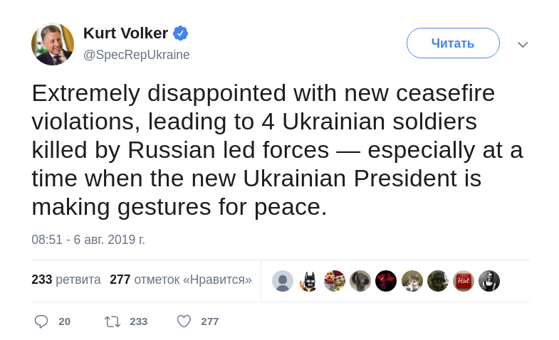 "Я очень разочарован новыми нарушениями режима прекращения огня, в результате которых четыре украинских военных были убиты силами, контролируемыми Россией, особенно в то время как новый президент Украины делает шаги по направлению к миру", - написал Волкер в Twitter.