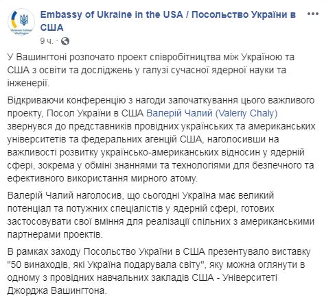 "Открывая конференцию по случаю начала этого важного проекта, посол Украины в США Валерий Чалый обратился к представителям ведущих украинских и американских университетов и федеральных агентств США, подчеркнув важность развития украинско-американских отношений в ядерной сфере, в частности в обмене знаниями и технологиями для безопасного и эффективного использования мирного атома", - говорится в сообщении.