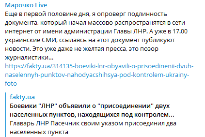 Отметим, что ранее по украинским СМИ прошел скрин якобы "указа" главы т.н. "ЛНР" Леонида Пасечника, которым он поручил включить Станицу Луганскую в состав территории "республики".