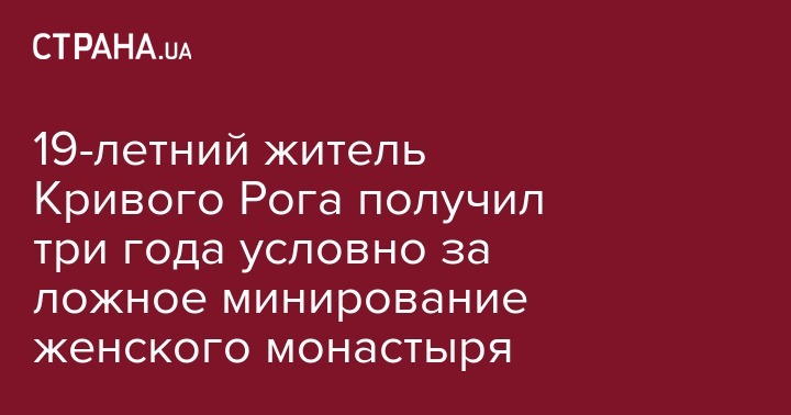 Криворожский Жовтневый районный суд приговорил к 3 годам тюрьмы условно с испытательным сроком на один год, 19-летнего жителя Кривого Рога за ложное сообщение о минировании Свято-Покровского женского монастыря. Об этом сообщает пресс-служба суда.