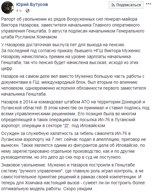 Генерал-майор ВСУ Виктор Назаров, обвиняемого в катастрофе ИЛ-76 в 2014 году, ушел с должности. Рапорт подписал начальник Генштаба Руслан Хомчак.