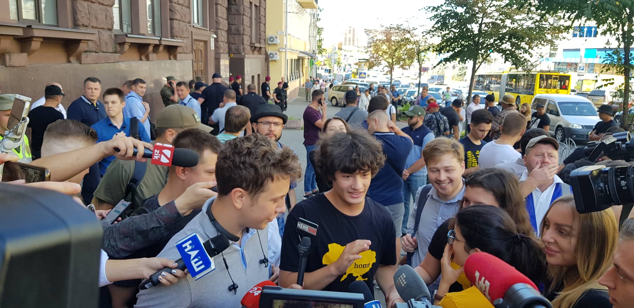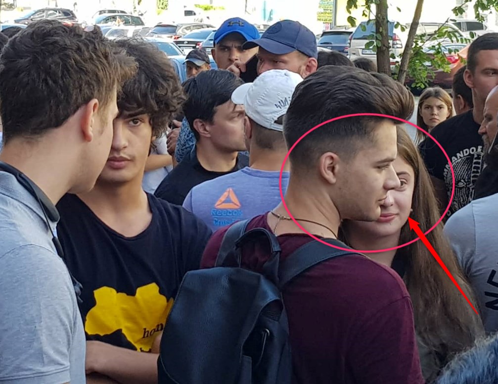 Миша Порошенко пришел с друзьями своего же возраста. Они окружили его и ограждали от внимания журналистов. Саша и Женя Порошенко - две сестры и дочери бывшего гаранта - стоят с плакатами.