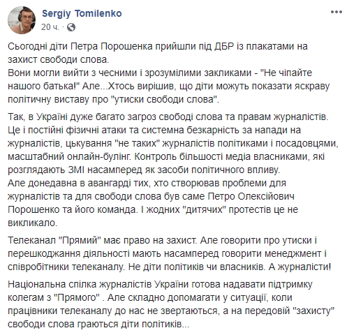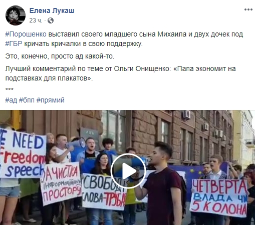 "Сегодня дети Петра Порошенко пришли под ГБР с плакатами в защиту свободы слова. Они могли выйти из честными и понятными призывами - "Не трогайте нашего отца!" Но ... Кто-то решил, что дети могут показать яркое политическое представление о "притеснениях свободы слова".