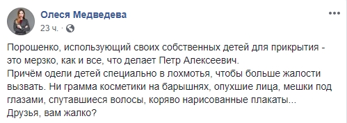 "Порошенко, использующий своих собственных детей для прикрытия - это мерзко, как и все, что делает Петр Алексеевич. Причем одели детей специально в лохмотья, чтобы больше жалости вызвать. Ни грамма косметики на барышнях, опухшие лица, мешки под глазами, спутавшиеся волосы, коряво нарисованные плакаты... Друзья, вам жалко?", - говорится в посте.