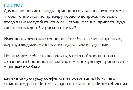 "Друзья, вот какие взгляды, принципы и качества нужно иметь, чтобы точно зная по примеру первого допроса, что возле входа в ГБР могут быть стычки и столкновения, привести туда собственных детей и рисковать ими?