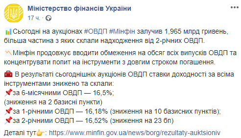 • по 2-летним ОВГЗ - 16,52% (снижение на 23 базисных пункта).