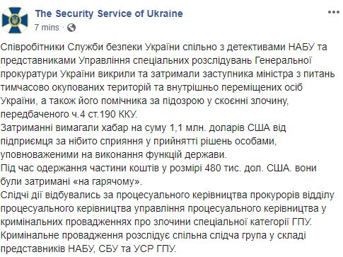 При этом в СБУ уточнили, что чиновник получил взятку в размере 1,1 млн долларов от предпринимателя за содействие в принятии решения