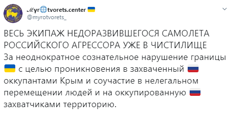 "Весь экипаж недоразвившегося самолета российского агрессора уже в чистилище. За неоднократное сознательное нарушение границы с целью проникновения в захваченный оккупантами Крым и соучастие в нелегальном перемещении людей на оккупированную захватчиками территорию", - говорится в сообщении.