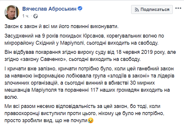 Валерий Кирсанов, осужденный в 2015 году на девять лет корректировщик огня по микрорайону "Восточный" в Мариуполе, 15 августа вышел на свободу. Об этом сообщает на своем Facebook замглавы Национальной полиции Вячеслав Аброськин.