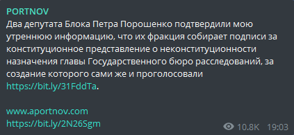 Он отметил, что два депутата от БПП уже подтвердили, что их фракция собирает подписи за конституционное представление о неконституционности назначения главы Государственного бюро расследований, за создание которого сами же и проголосовали.