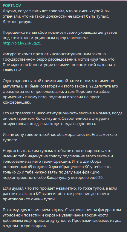 "Надо ж быть таким тупым, чтобы не прогнозировать, что именно тебе наденут на голову подписание этого закона и голосование за него твоей фракции. И что для сбора положенных 45 подписей для обращение в КС у тебя есть только 25 и тебе нужно взять по делу ещё фракцию подконтрольного себе Вакарчука, у которого ещё 20. Если думал, что это пройдёт незаметно, то тоже тупой, а если рассчитывал, что КС вынесет об этом решение до твоего приговора - то очень тупой", - подчеркнул Портнов.