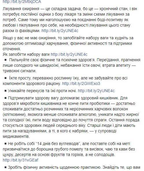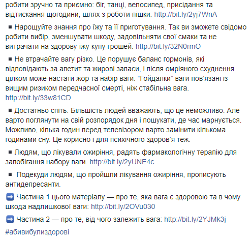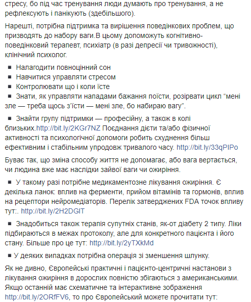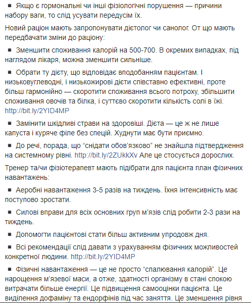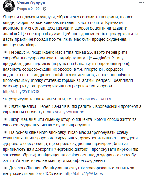 "На основе клинического вывода, врач должен предложить схему похудения: план здорового питания, физической активности, построения здоровой среды, которая способствует похудению (например, близкие прекращают вас упрекать "очередной диетой" и предлагать пирожки под угрозой оскорбления) и повышение образованности по здоровому образу жизнь. Но это точно не должен быть марафон похудения", - пишет Ульяна Супрун.