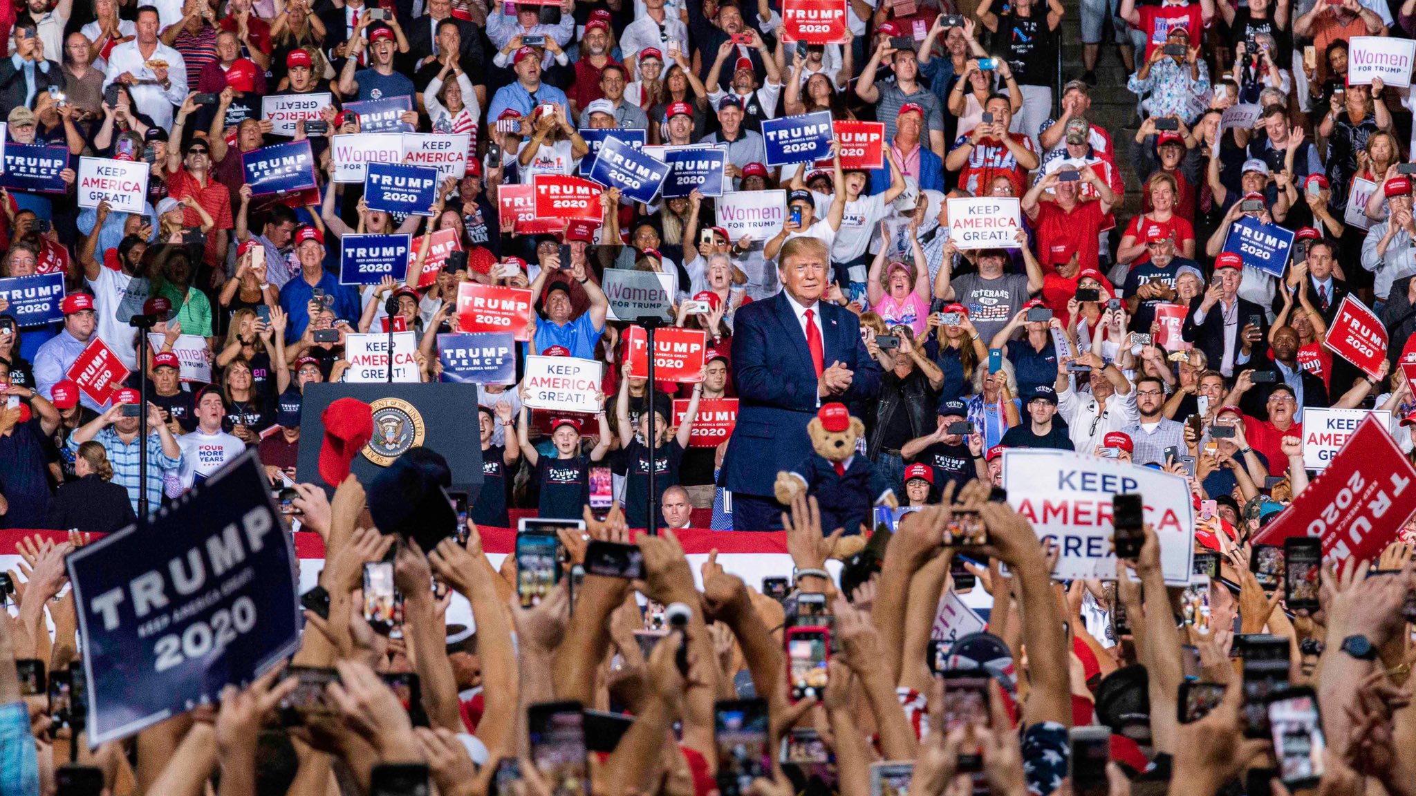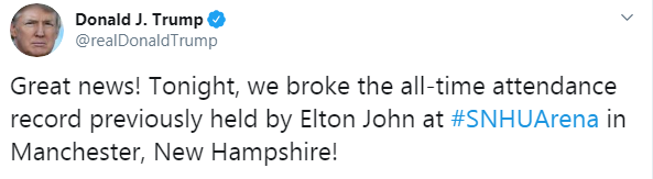 "Великолепные новости! Сегодня вечером мы побили беспрецедентный рекорд по посещаемости, установленный ранее во время (концерта - Ред.) Элтона Джона на стадионе SNHU Arena в Манчестере в Нью-Гэмпшире", - написал президент США в своем Twitter.