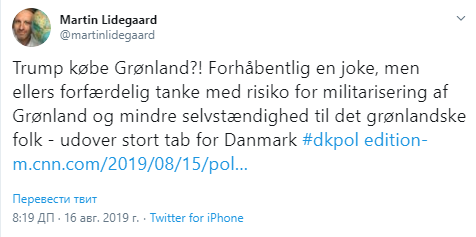 "Трамп покупает Гренландию?! Надеюсь, шутка, но в остальном ужасная мысль с риском милитаризации Гренландии и меньшей независимости гренландского народа - помимо большой потери для Дании", - считает экс-министр иностранных дел Мартин Лидегор.