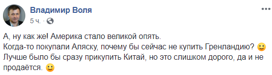 "Когда-то покупали Аляску, почему бы сейчас не купить Гренландию? Лучше было бы сразу прикупить Китай, но это слишком дорого, да и не продается", - иронизирует политолог Владимир Воля.
