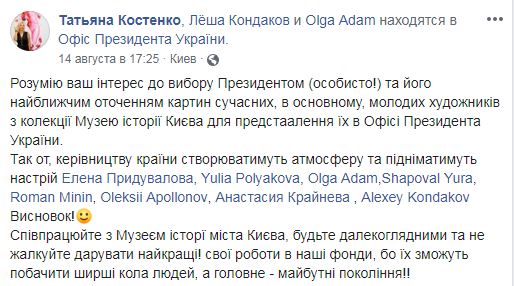 Стены Офиса президента Украины украсили картинами молодых украинских художников из коллекции Музея истории Киева. Работы выбирал лично Владимир Зеленский. Об этом сообщила замдиректора музея Татьяна Костенко на своей странице в Facebook.