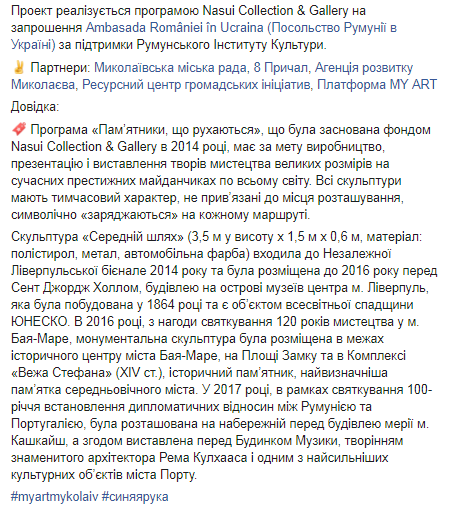 Уточняется, что таким образом Николаев присоединится к международному проекту "Moving Monuments/Движущиеся памятники". В его рамках скульптура путешествует по миру, символизируя таким образом дружбу и общению. "Синяя рука" уже побывала на центральных площадях в разных городах Европы. Так, ее выставляли в Великобритании, Румынии, Португалии и Киеве. В Николаеве скульптура будет установлена на набережной "8 Причал" во время старта образовательно-художественной программы "Дни современного искусства в Николаеве".