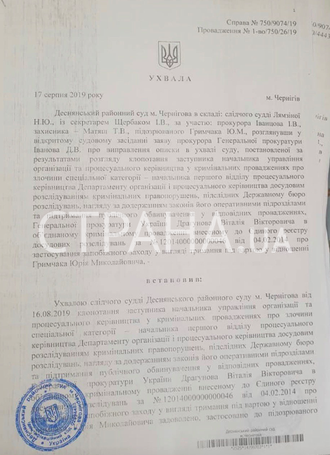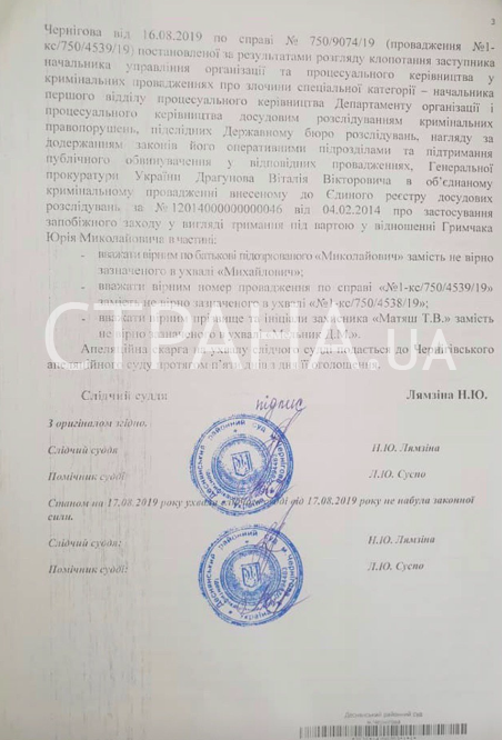 В субботу, 17 августа, Черниговский суд по собственной инициативе исправил свои ошибки в документах, подготовленных для задержания замминистра по вопросам оккупированных территорий Юрия Грымчака. Об этом сообщает корреспондент "Страны".
